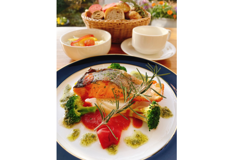 境港サーモンを香ばしくグリルし、季節の野菜を添えました。爽やかな酸味のトマトと、香り高いバジルを合わせたソースが、サーモンの旨みを引き立てます☆。.:*・゜